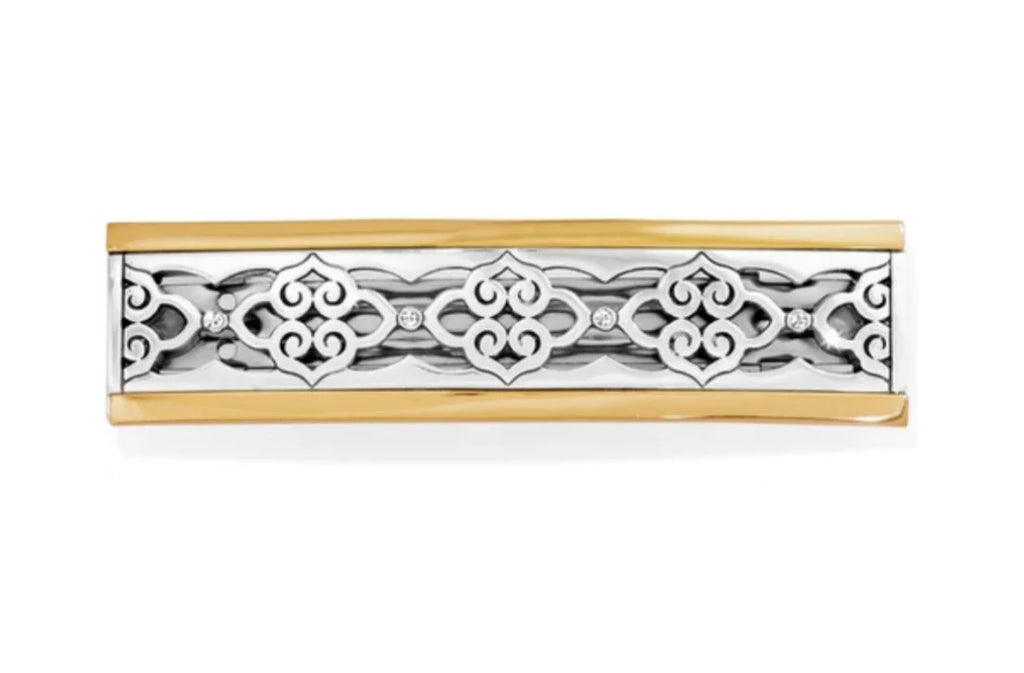 This stunning barrette, with silver-plated scrollwork and golden-hued borders, brings artistry, intrigue, and craftsmanship to your look. Dress your tresses with artistry and intricate details.