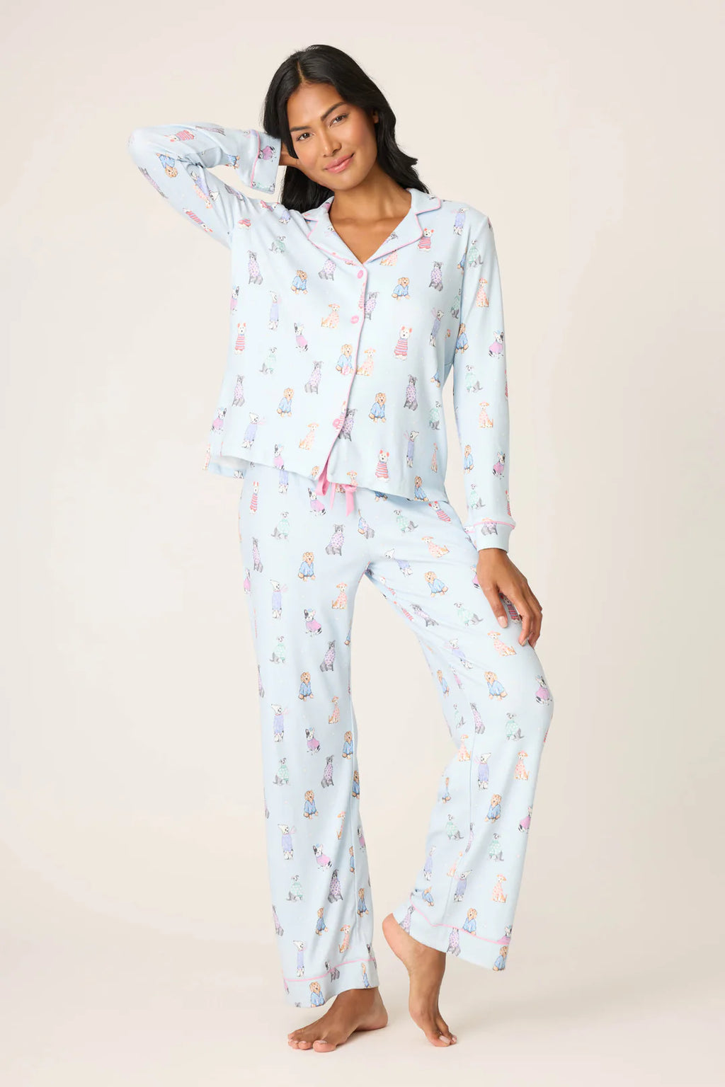 Paw-sitively cozy and snow much fun, this pajama set is crafted from double-brushed pointelle with a light blue backdrop dotted in playful pups dressed for winter. The button-front top and relaxed drawstring pants make it as classic as it is comfy—perfect for snow days, couch hangs, and curling up with your four-legged friend.