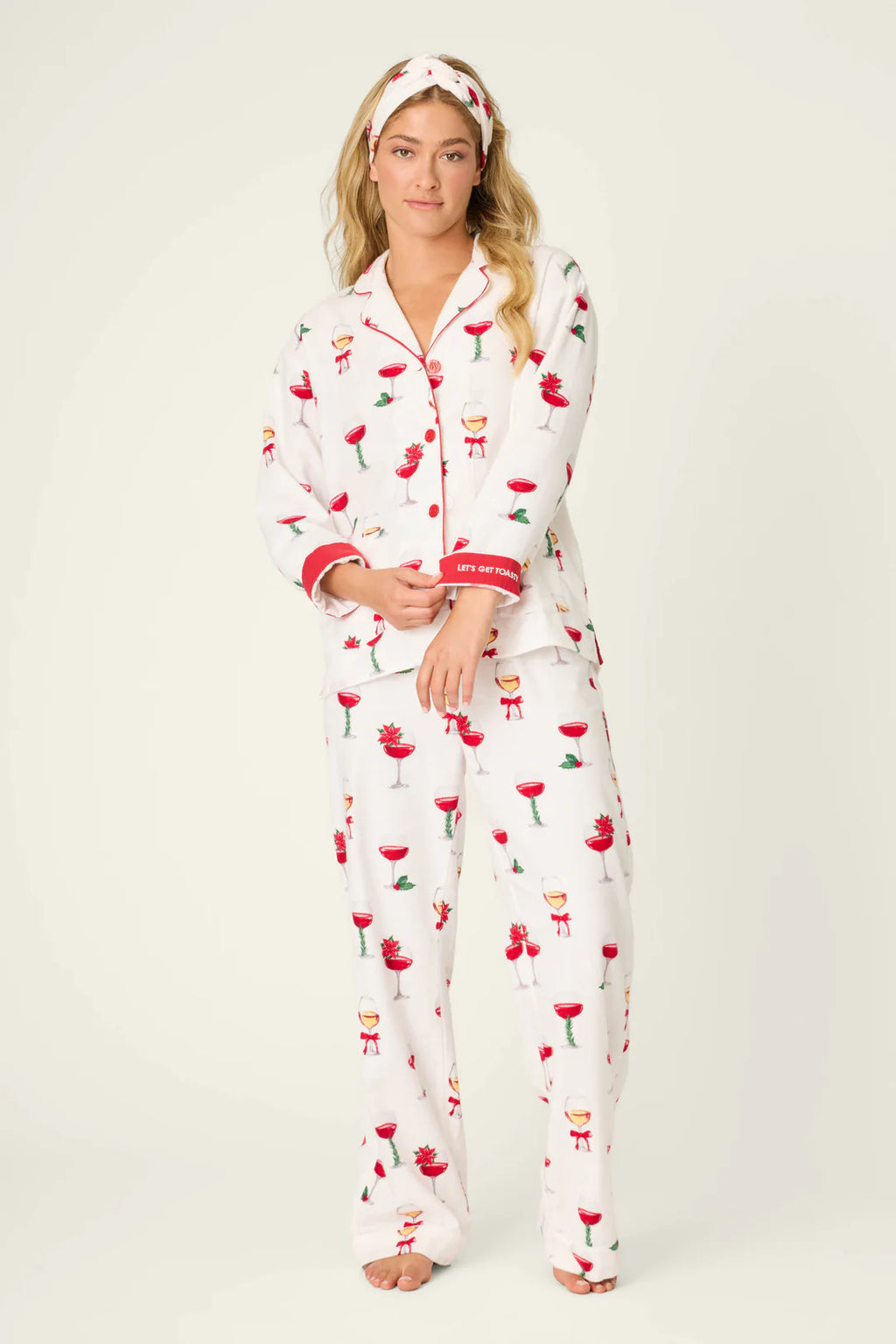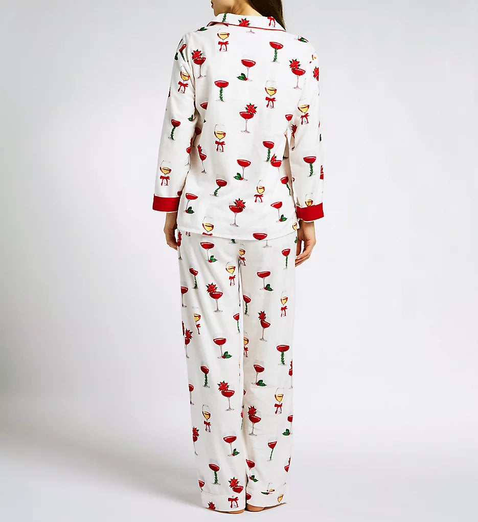 Raise a glass to cozy season in this ivory cotton flannel pajama set, patterned with festive wine glasses topped with poinsettias, bows, and sprigs of holly. This plus-size three-piece design includes a button-down top finished with red piping, relaxed drawstring pants, and a matching headband—perfect for holiday happy hours, wrapping marathons, and fireside lounging.
