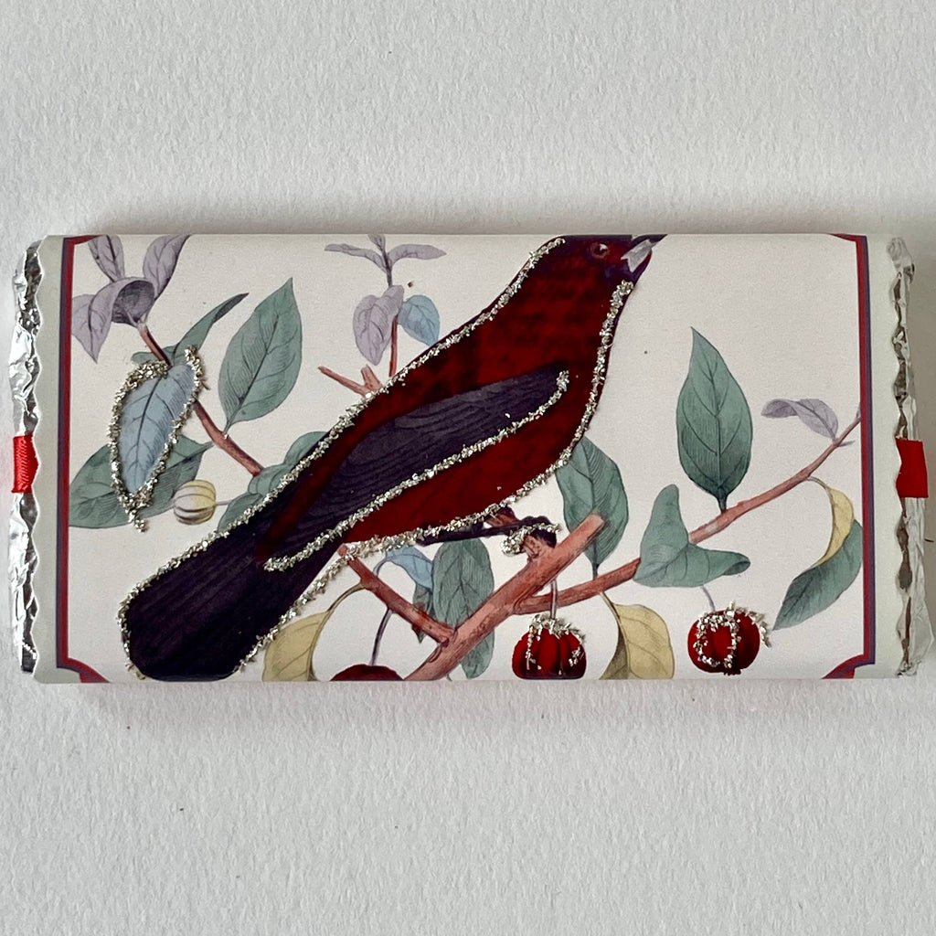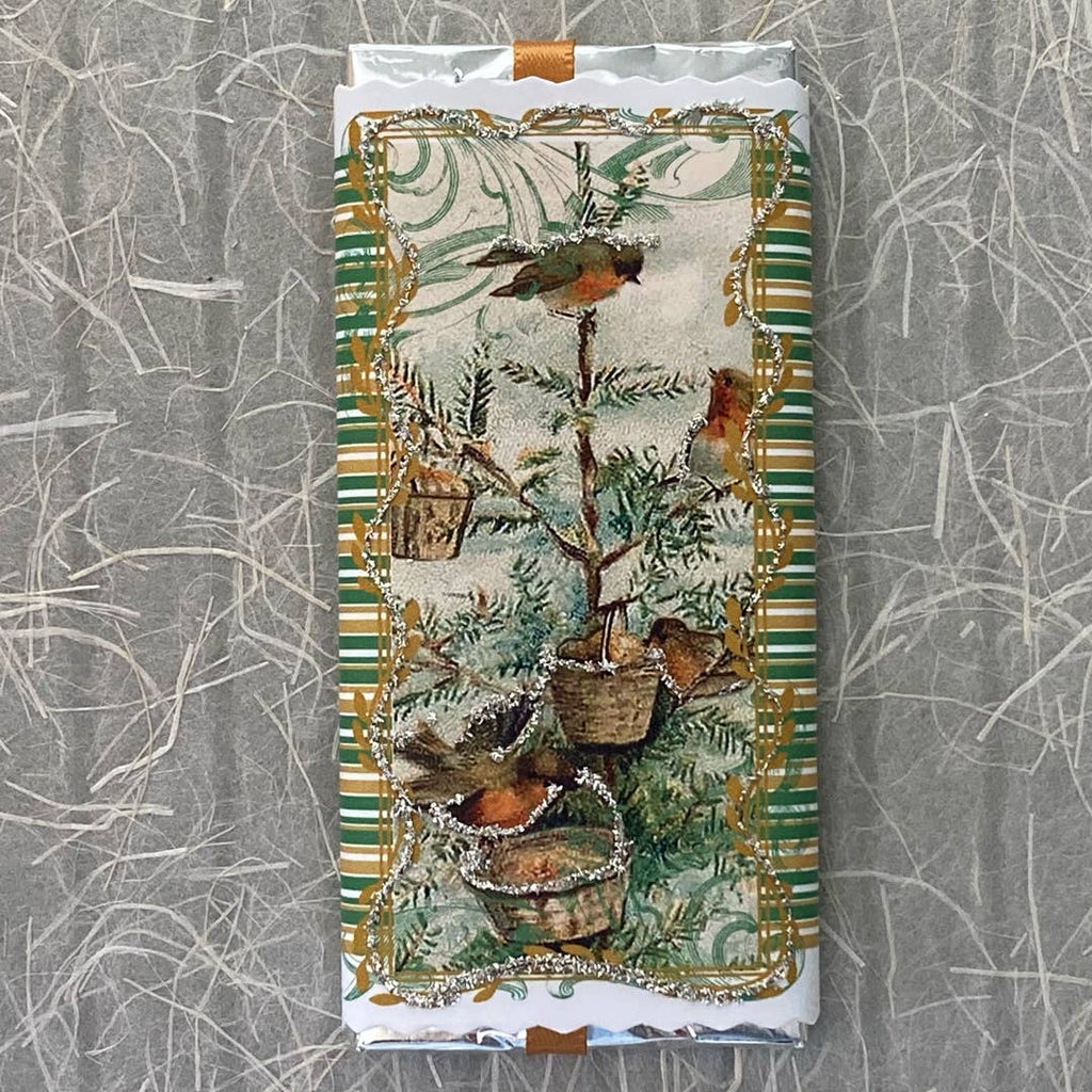 2x4.25' chocolate bar, 50g Belgian dark or milk chocolate, in vintage wrap embellished with glass glitter. Order in 4's