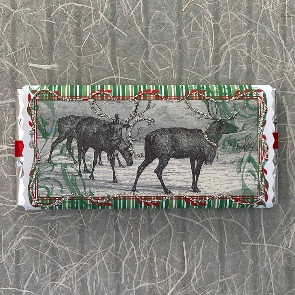 2x4.25' chocolate bar, 50g Belgian dark or milk chocolate, in vintage wrap embellished with glass glitter. Order in 4's